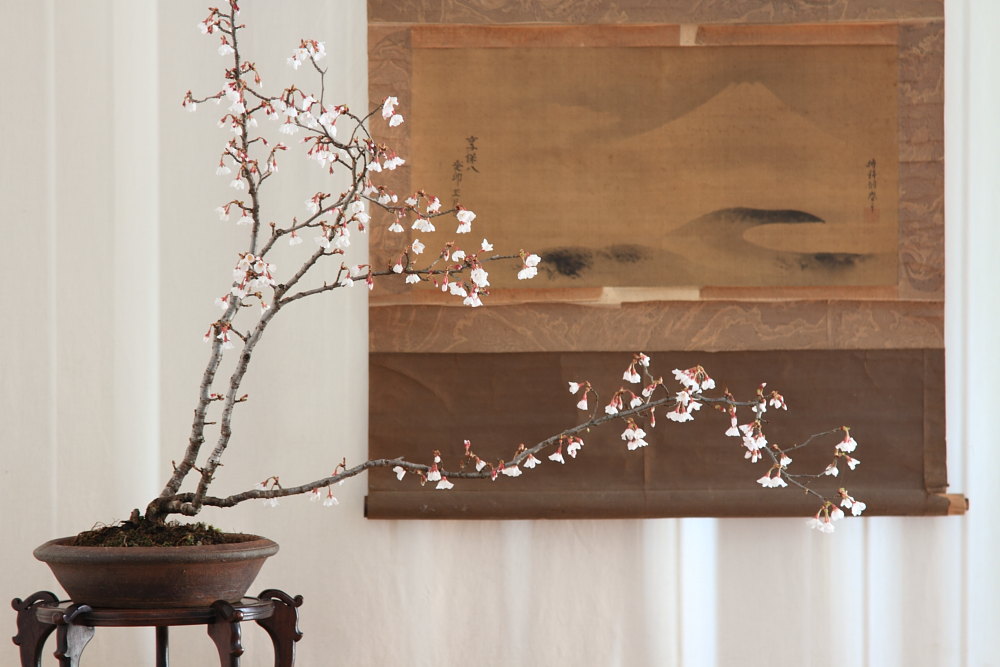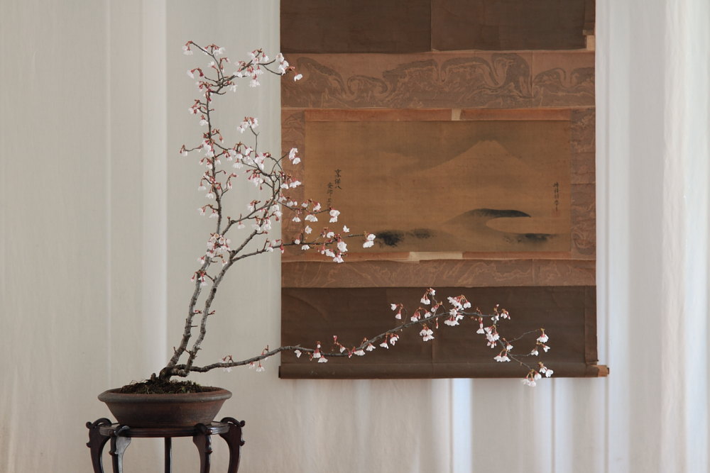 Bello questo allestimento.Il kakejiku però, a mio modesto avviso, appesantisce l’insieme e si sovrappone con il ramo del sankan.
