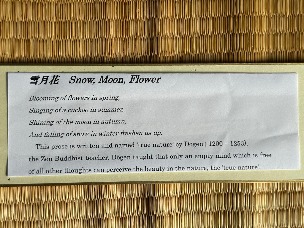 This prose is written and named true nature’ by Dögen (1200 – 1253), the Zen Buddhist teacher. Dögen taught that only an empty mind which is free of all other thoughts can perceive the beauty in the nature, the ‘true nature’.