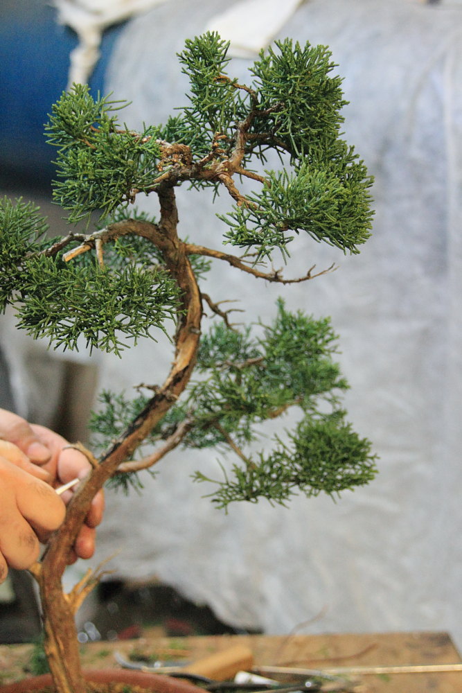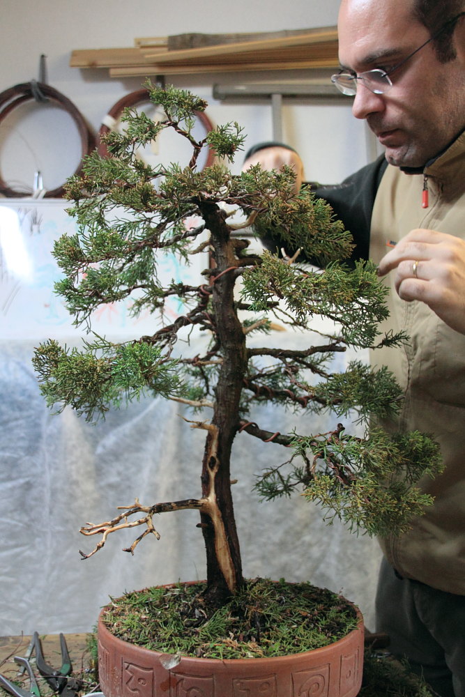 Alessandro oggi lavora un ginepro chinensis da garden, di una qualità di fogliame molto buona.