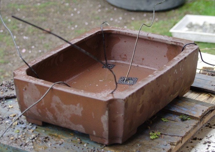 Alla fine di marzo del 2009, aiutato dall’amico Mario, ho effettuato il rinvaso del mugo in un vaso definitivo, in un vaso tokoname rettangolare con gli angoli smussati rientranti.