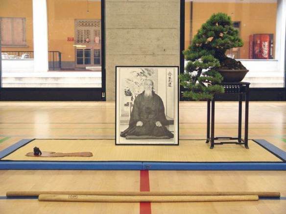 In questo allestimento il bonsai diventa un elemento secondario. L’elemento principale è chiaramente il ritratto di Ueshiba il fondatore dell’Aikido.